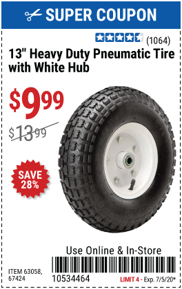 Harbor Freight Coupon 13" HEAVY DUTY PNEUMATIC TIRE WITH WHITE HUB Lot No. 69382 Expired: 7/5/20 - $9.99 13" HEAVY DUTY PNEUMATIC TIRE WITH WHITE HUB Lot No. 69382 Expired: 7/5/20 - $9.99 Coupon Code: '10534464'