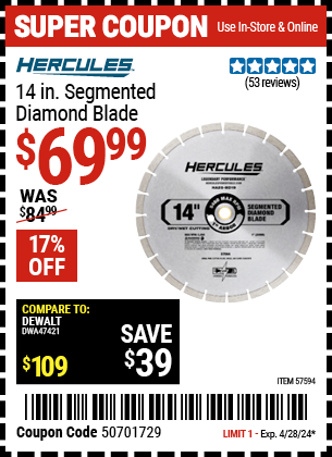 14" SEGMENTED WET/DRY CUT DIAMOND BLADE Lot No. 68879 Expired: 4/28/24 - $69.99 Coupon Code: '50701729'