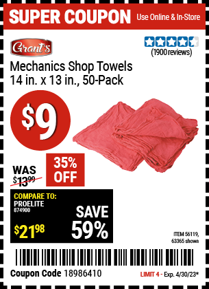 14" X 13" SHOP TOWELS PACK OF 50 Lot No. 63365/64730/56119/63360 Expired: 9/18/22 - $9.99 Coupon Code: '66702822'