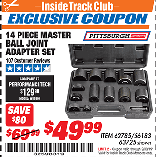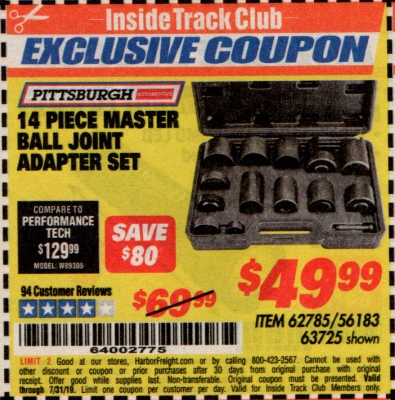 14 PIECE MASTER BALL JOINT ADAPTER SET Lot No. 62785/63725/60307 Expired: 7/22/21 - $49.99 Coupon Code: 'n/a'