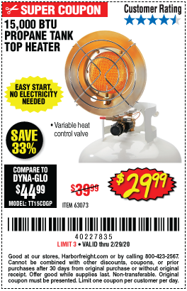 15,000 BTU PROPANE TANK TOP HEATER Lot No. 63073 Expired: 2/29/20 - $29.99 Coupon Code: '40227835'