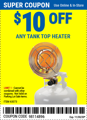 15,000 BTU PROPANE TANK TOP HEATER Lot No. 63073 Expired: 12/2/19 - $29.99 Coupon Code: '34366307'