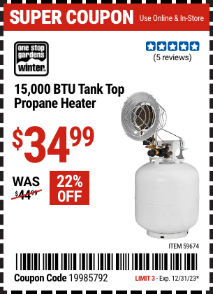 15,000 BTU PROPANE TANK TOP HEATER Lot No. 63073 Expired: 12/31/23 - $34.99 Coupon Code: '19985792'