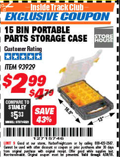 ITC 15 BIN PORTABLE PARTS STORAGE CASE Lot No. 93929 Expired: 4/30/18 - $2.99 Coupon Code: '12715746'