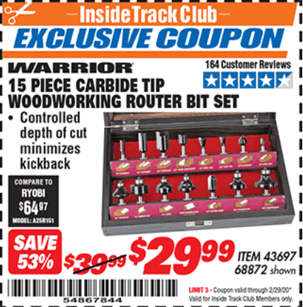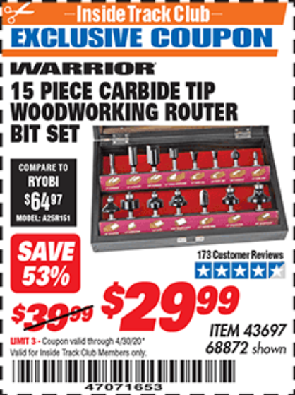 15 PIECE CARBIDE TIP WOODWORKING ROUTER BIT SET Lot No. 68872 Expired: 10/31/20 - $29.99 Coupon Code: 'n/a'