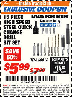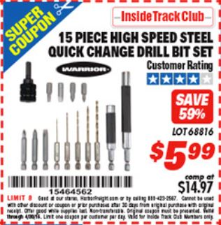 ITC 15 PIECE HIGH SPEED STEEL QUICK CHANGE DRILL BIT SET Lot No. 68816 Expired: 4/30/18 - $5.99 Coupon Code: '12233987'