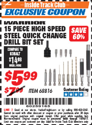 ITC 15 PIECE HIGH SPEED STEEL QUICK CHANGE DRILL BIT SET Lot No. 68816 Expired: 11/30/17 - $5.99 Coupon Code: '60259165'