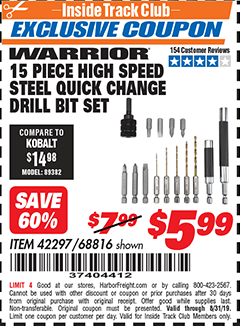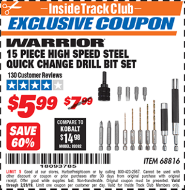 ITC 15 PIECE HIGH SPEED STEEL QUICK CHANGE DRILL BIT SET Lot No. 68816 Expired: 2/28/19 - $5.99 Coupon Code: '18093785'