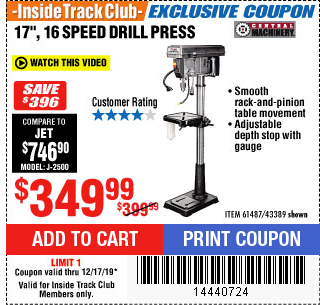 17", 16 SPEED DRILL PRESS Lot No. 61487/43389 Expired: 2/5/23 - $379.99 Coupon Code: '96820730'