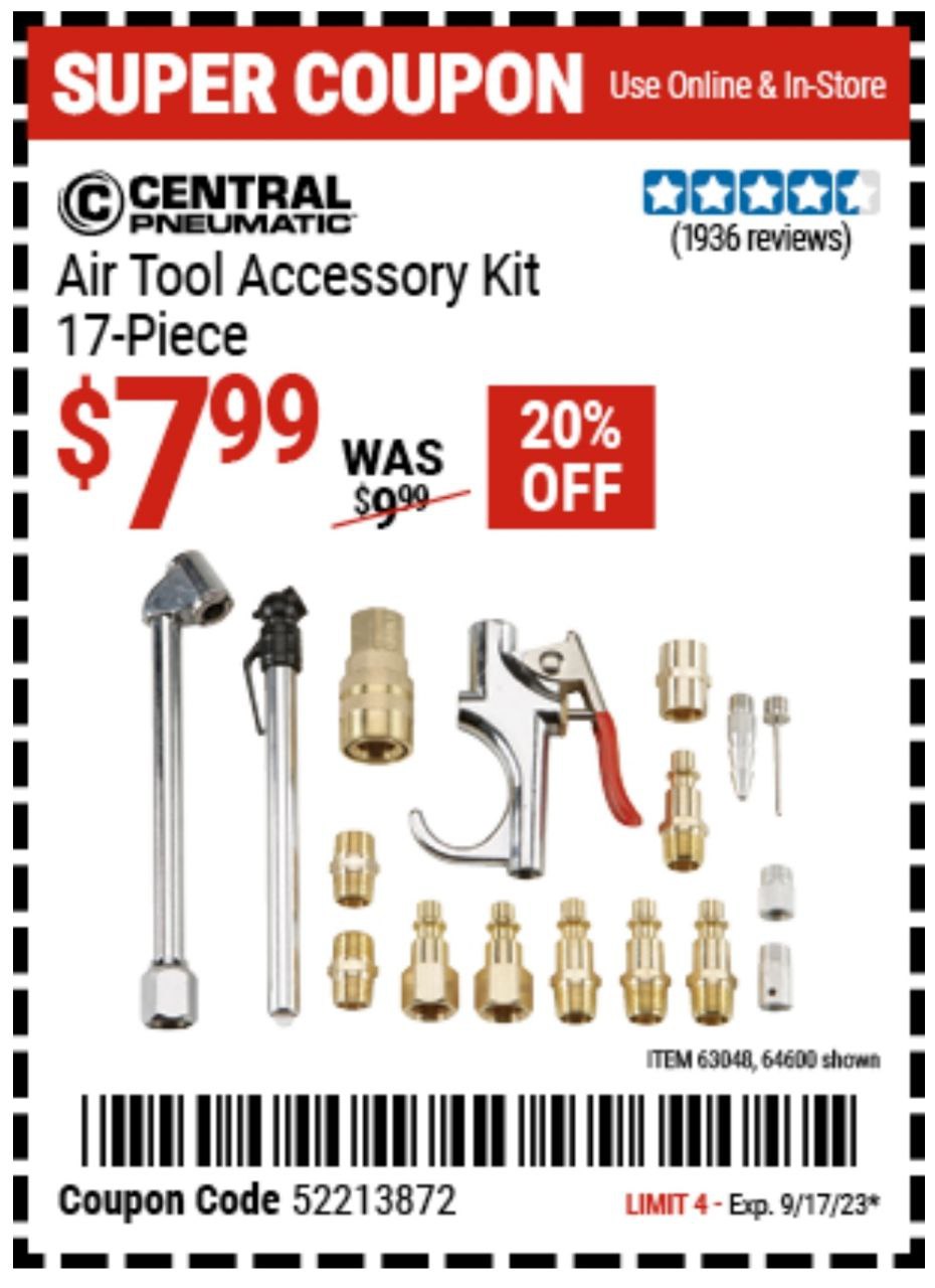 17 PC AIR TOOL ACCESSORY KIT Lot No. 63048 Expired: 9/17/23 - $7.99 Coupon Code: '52213872'