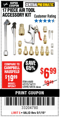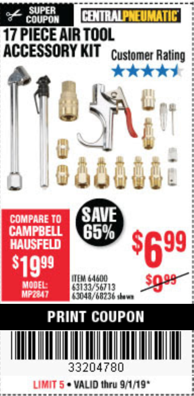 17 PIECE AIR TOOL ACCESSORY KIT Lot No. 64600/63133/61449/63048/68236 Expired: 9/1/19 - $6.99 Coupon Code: '33204780'
