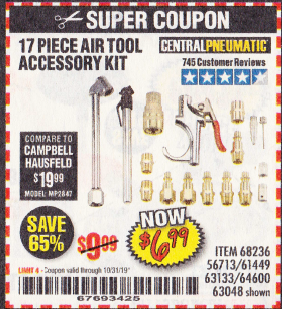 17 PIECE AIR TOOL ACCESSORY KIT Lot No. 64600/63133/61449/63048/68236 Expired: 10/31/19 - $6.99 Coupon Code: '67693425'
