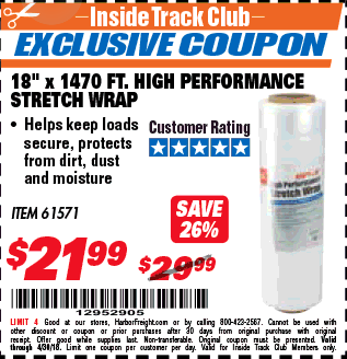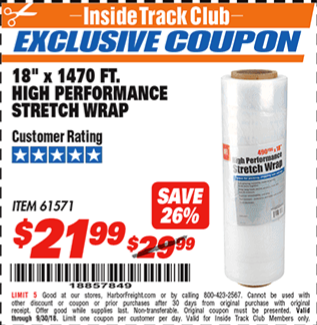 ITC 18" 1470 FT. HIGH PERFORMANCE STRETCH WRAP Lot No. 61571/94172 Expired: 4/30/19 - $21.99 Coupon Code: '18677506'