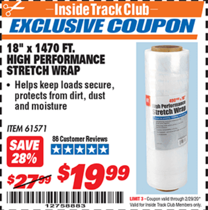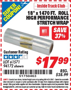 ITC 18" 1470 FT. HIGH PERFORMANCE STRETCH WRAP Lot No. 61571/94172 Expired: 2/29/20 - $19.99 Coupon Code: '12758883'