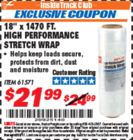 ITC 18" 1470 FT. HIGH PERFORMANCE STRETCH WRAP Lot No. 61571/94172 Expired: 3/31/21 - $19.99 Coupon Code: 'n/a'