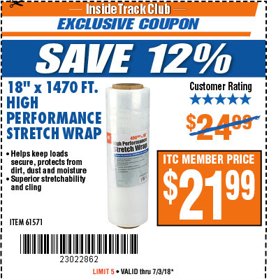 ITC 18" 1470 FT. HIGH PERFORMANCE STRETCH WRAP Lot No. 61571/94172 Expired: 7/3/18 - $21.99 Coupon Code: '23022862'