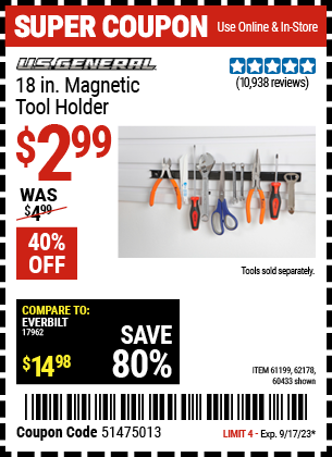 U.S. GENERAL 18 IN. MAGNETIC TOOL HOLDER Lot No. 60433/61199 Expired: 9/17/23 - $2.99 Coupon Code: '51475013'