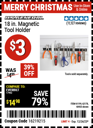 U.S. GENERAL 18 IN. MAGNETIC TOOL HOLDER Lot No. 60433/61199 Expired: 11/24/19 - $2.99 Coupon Code: '18028893'