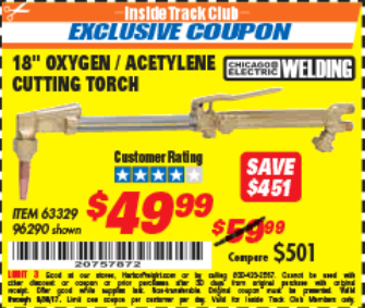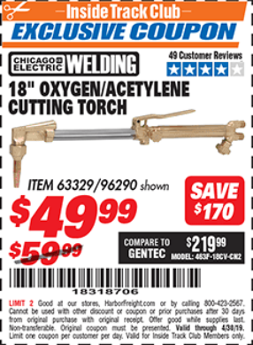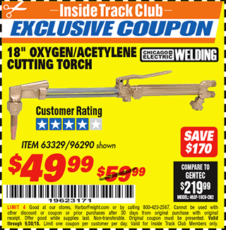 ITC 18" OXYGEN ACETYLENE CUTTING TORCH Lot No. 63329/96290 Expired: 4/30/19 - $49.99 Coupon Code: '18318706'