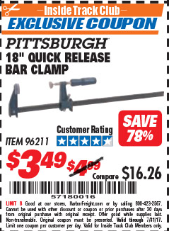 ITC 18" QUICK RELEASE BAR CLAMP Lot No. 96211 Expired: 7/31/17 - $3.49 Coupon Code: '57180016'