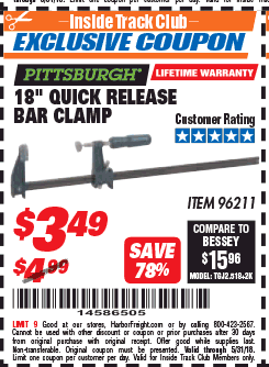 ITC 18" QUICK RELEASE BAR CLAMP Lot No. 96211 Expired: 5/31/18 - $3.49 Coupon Code: '14586505'