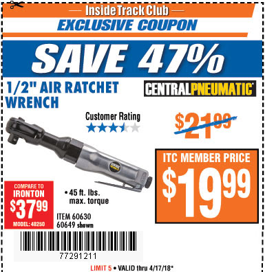 ITC 1/2" AIR RATCHET WRENCH Lot No. 60649/35227/60630 Expired: 4/17/18 - $19.99 Coupon Code: '77291211'