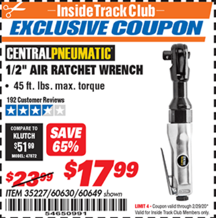 ITC 1/2" AIR RATCHET WRENCH Lot No. 60649/35227/60630 Expired: 2/29/20 - $17.99 Coupon Code: '54650991'
