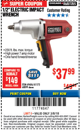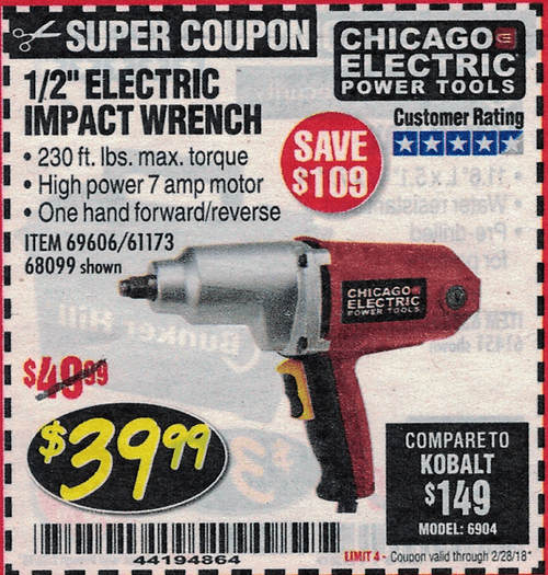 1/2" ELECTRIC IMPACT WRENCH Lot No. 31877/61173/68099/69606 Expired: 2/28/19 - $39.99 Coupon Code: '98255572'