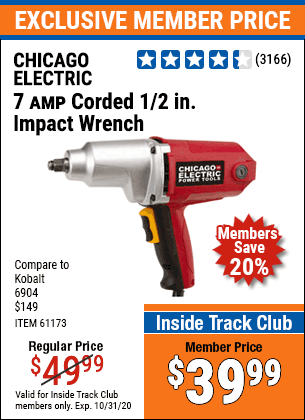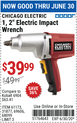 1/2" ELECTRIC IMPACT WRENCH Lot No. 31877/61173/68099/69606 Expired: 6/30/20 - $39.99 Coupon Code: '21007035'