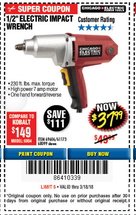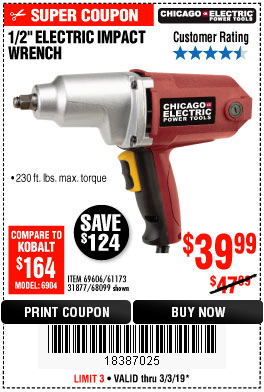 1/2" ELECTRIC IMPACT WRENCH Lot No. 31877/61173/68099/69606 Expired: 3/3/19 - $39.99 Coupon Code: '18387025'