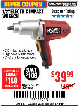 1/2" ELECTRIC IMPACT WRENCH Lot No. 31877/61173/68099/69606 Expired: 5/14/18 - $39.99 Coupon Code: '26983296'
