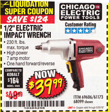 1/2" ELECTRIC IMPACT WRENCH Lot No. 31877/61173/68099/69606 Expired: 6/30/18 - $39.99 Coupon Code: '10385258'