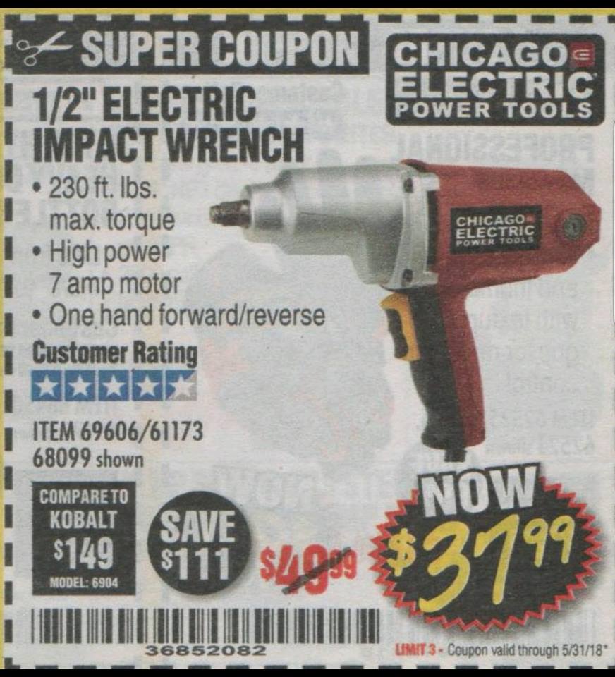 1/2" ELECTRIC IMPACT WRENCH Lot No. 31877/61173/68099/69606 Expired: 5/27/18 - $39.99 Coupon Code: '63737432'