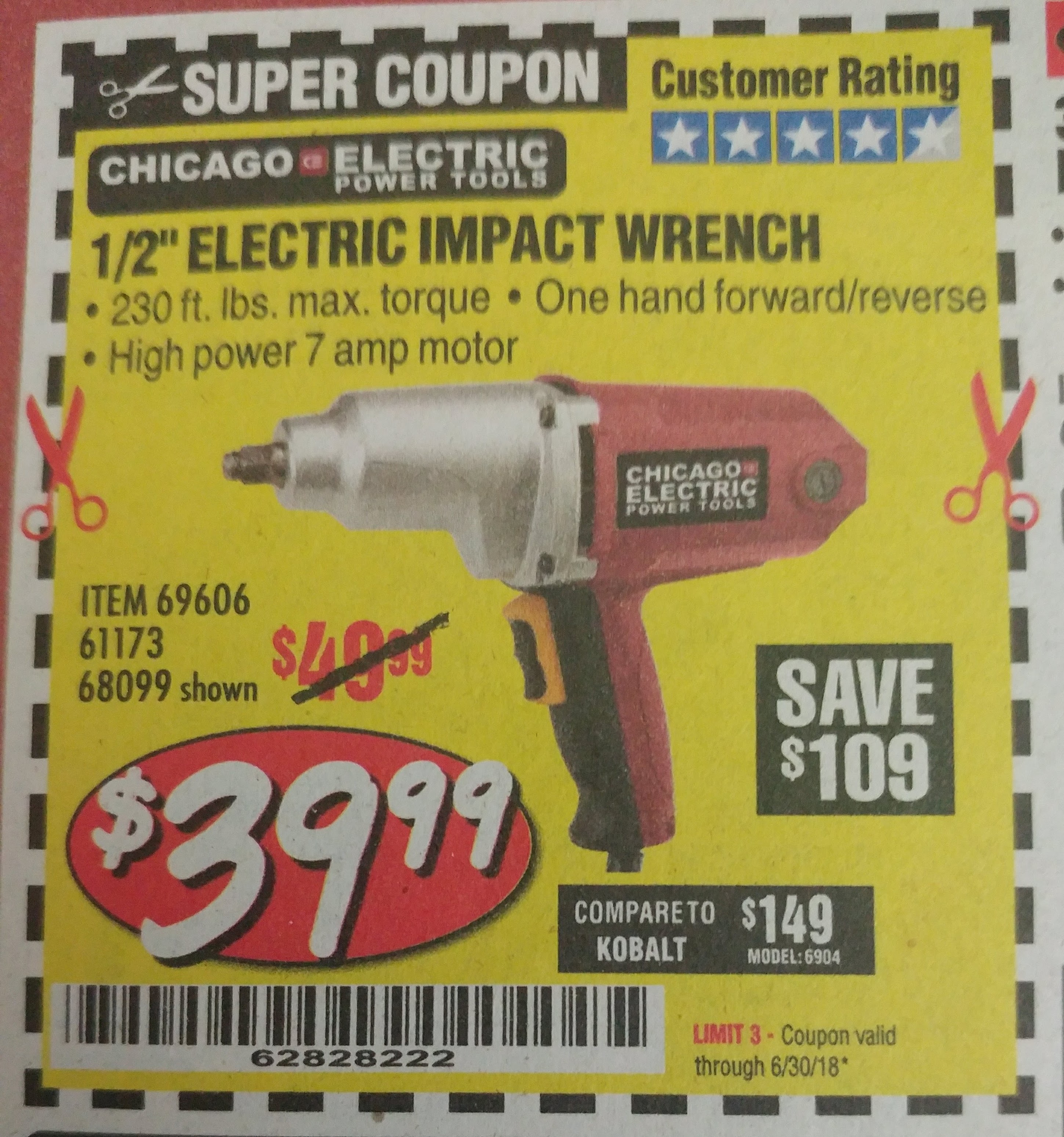 1/2" ELECTRIC IMPACT WRENCH Lot No. 31877/61173/68099/69606 Expired: 6/30/18 - $39.99 Coupon Code: '62828222'