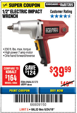 1/2" ELECTRIC IMPACT WRENCH Lot No. 31877/61173/68099/69606 Expired: 6/24/18 - $39.99 Coupon Code: '66809150'