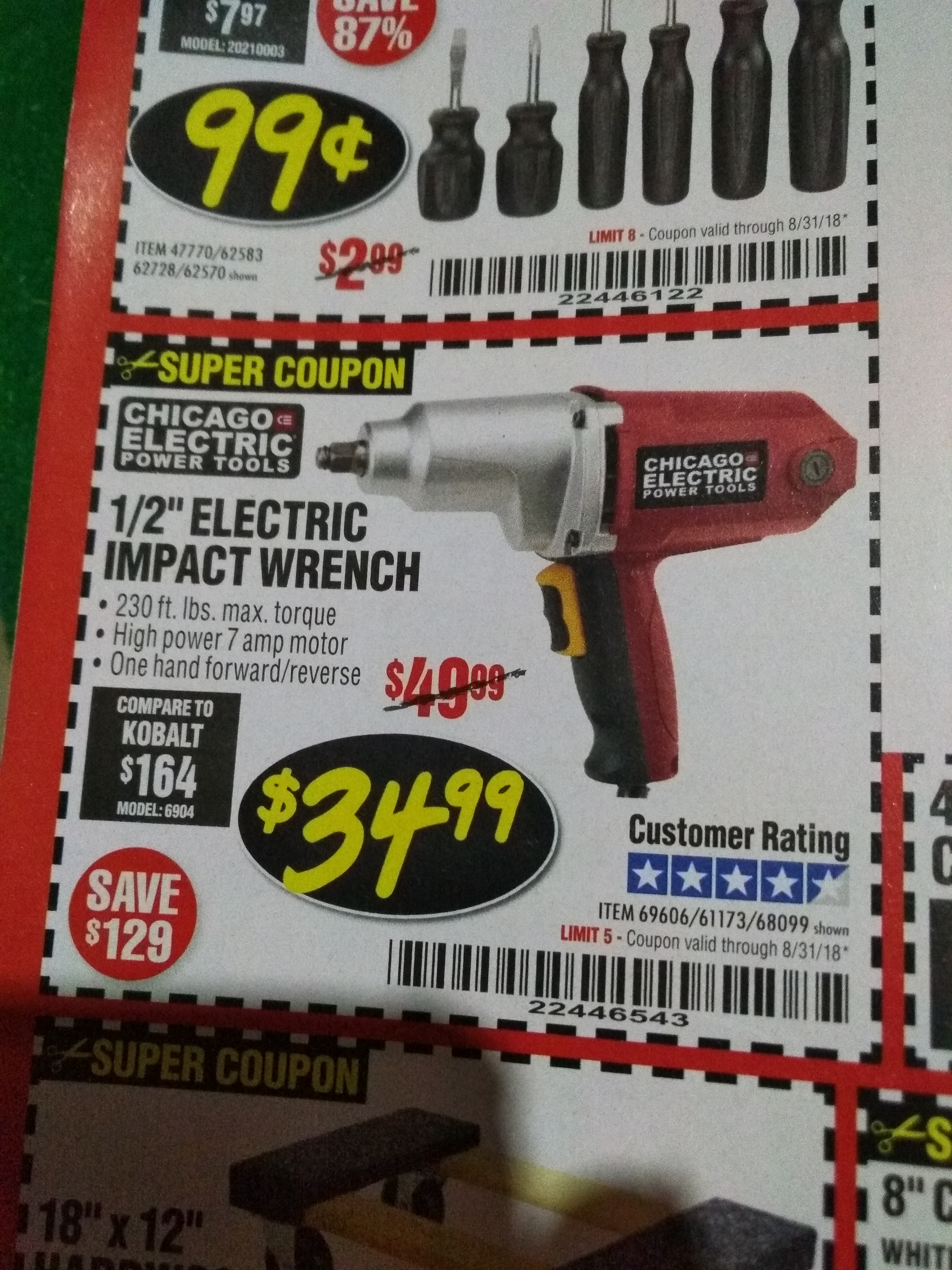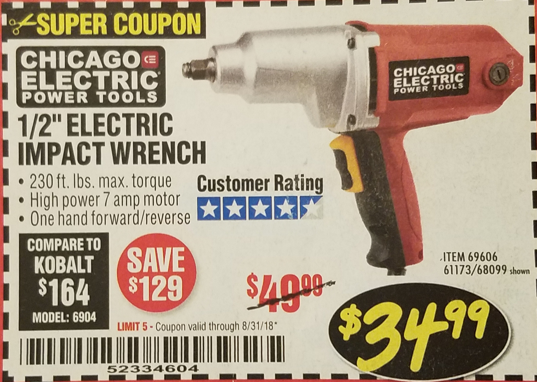 1/2" ELECTRIC IMPACT WRENCH Lot No. 31877/61173/68099/69606 Expired: 8/31/18 - $34.99 Coupon Code: '52334604'