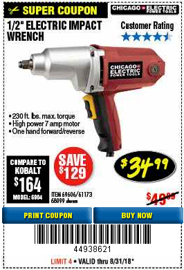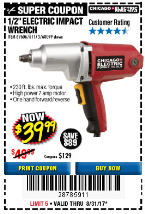 1/2" ELECTRIC IMPACT WRENCH Lot No. 31877/61173/68099/69606 Expired: 8/31/17 - $39.99 Coupon Code: '28785911'