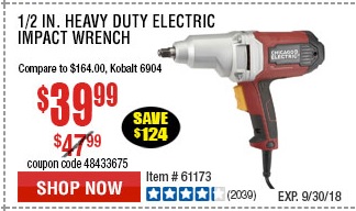 1/2" ELECTRIC IMPACT WRENCH Lot No. 31877/61173/68099/69606 Expired: 9/30/18 - $39.99 Coupon Code: '48433675'
