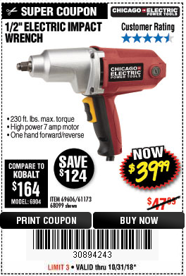 1/2" ELECTRIC IMPACT WRENCH Lot No. 31877/61173/68099/69606 Expired: 10/31/18 - $39.99 Coupon Code: '30894243'