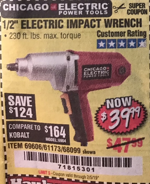 1/2" ELECTRIC IMPACT WRENCH Lot No. 31877/61173/68099/69606 Expired: 2/5/19 - $39.99 Coupon Code: '71815301'