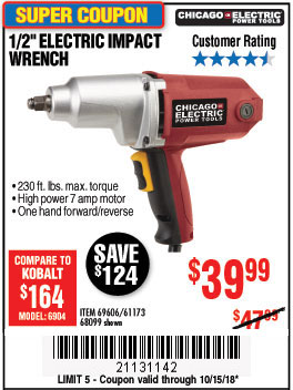 1/2" ELECTRIC IMPACT WRENCH Lot No. 31877/61173/68099/69606 Expired: 10/15/18 - $39.99 Coupon Code: '21131142'