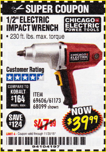 1/2" ELECTRIC IMPACT WRENCH Lot No. 31877/61173/68099/69606 Expired: 11/30/18 - $39.99 Coupon Code: '94104197'