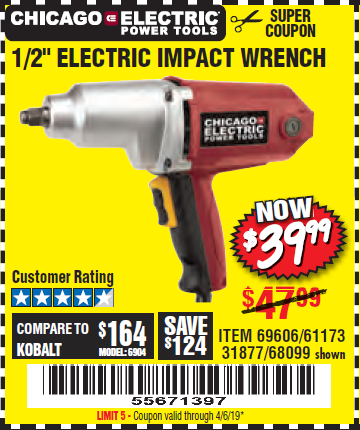 1/2" ELECTRIC IMPACT WRENCH Lot No. 31877/61173/68099/69606 Expired: 4/6/19 - $39.99 Coupon Code: '55671397'