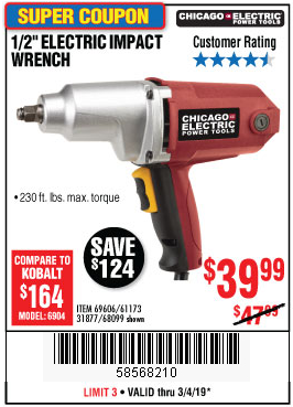 1/2" ELECTRIC IMPACT WRENCH Lot No. 31877/61173/68099/69606 Expired: 3/4/19 - $39.99 Coupon Code: '58568210'