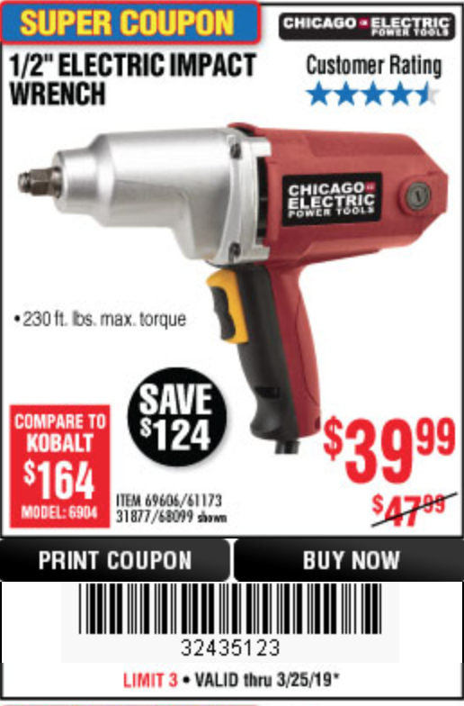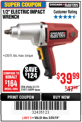 1/2" ELECTRIC IMPACT WRENCH Lot No. 31877/61173/68099/69606 Expired: 3/25/19 - $39.99 Coupon Code: '32435123'