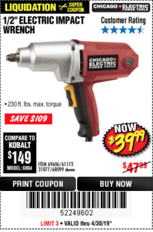 1/2" ELECTRIC IMPACT WRENCH Lot No. 31877/61173/68099/69606 Expired: 4/30/19 - $39.99 Coupon Code: '52249602'