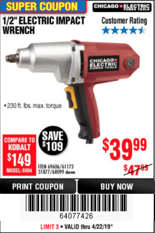 1/2" ELECTRIC IMPACT WRENCH Lot No. 31877/61173/68099/69606 Expired: 4/22/19 - $39.99 Coupon Code: '64077426'