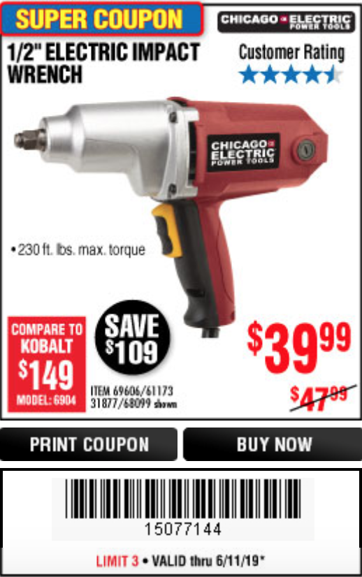 1/2" ELECTRIC IMPACT WRENCH Lot No. 31877/61173/68099/69606 Expired: 6/11/19 - $39.99 Coupon Code: '15077144'