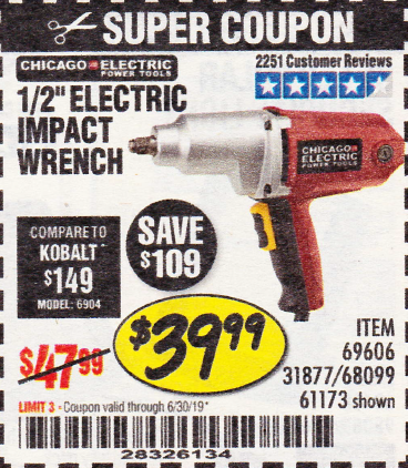 1/2" ELECTRIC IMPACT WRENCH Lot No. 31877/61173/68099/69606 Expired: 6/30/19 - $39.99 Coupon Code: '28326134'