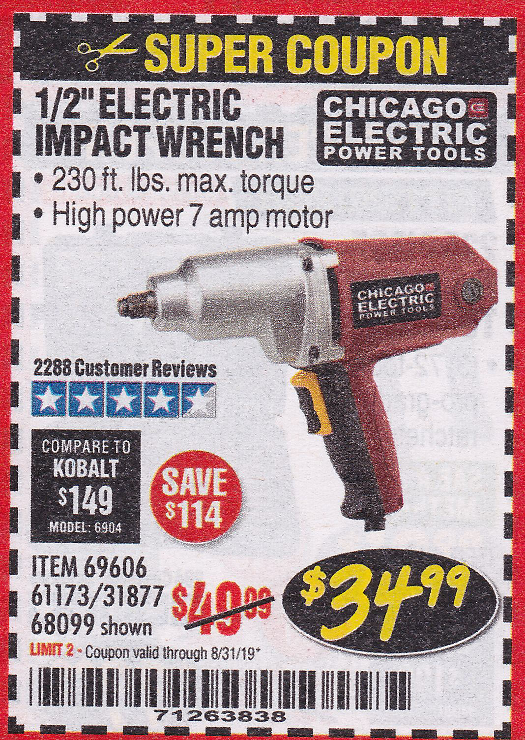 1/2" ELECTRIC IMPACT WRENCH Lot No. 31877/61173/68099/69606 Expired: 8/31/19 - $34.99 Coupon Code: '71263838'